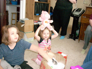 At Bryan's house we feasted on a big Christmas breakfast with yummy hash browns and eggs, and a choice of eggnog or juice. We ate while we watched the movie "A Christmas Story." When everyone was done eating we followed Dominique to the Christmas tree and watched her open all of her many presents. Santa was very good to Dominique, so she must have been a very good girl this year.